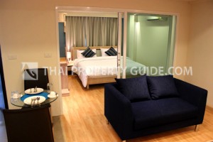 A condominium with Air Chiller, Pantry Built in, Fully furnished (bed, sofa, dining table, closet, stand TV) Laminate floor, Wall paper. Swimming Pool (Outdoor 10th,Indoor 34th) 34th relaxing area, view point city and joking track. 22nd Roof garden, Playground, relaxing area and view point City. 10th ( Mini-golf, Squash, Sauna, Jacuzzi, Aerobics classes, Spa)